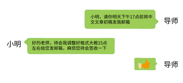 先回复“收到”,厘清逻辑,分要点表达想法,如下图所示;时间上,不要太晚联系导师,然后一直催回复(尽量不要在饭点和非工作时间联系导师),不要赶着 deadline才催老师签字(预留好时间)。