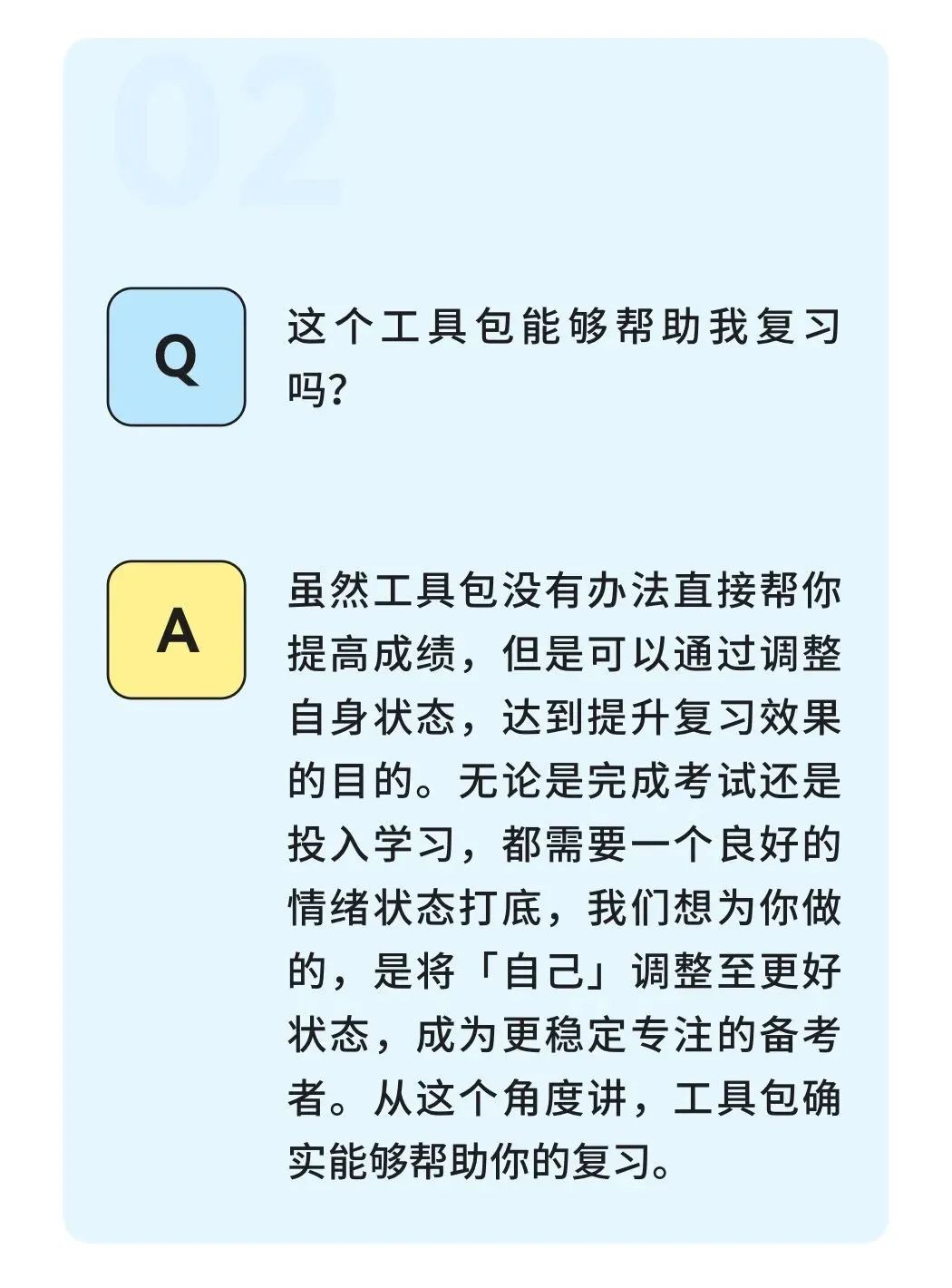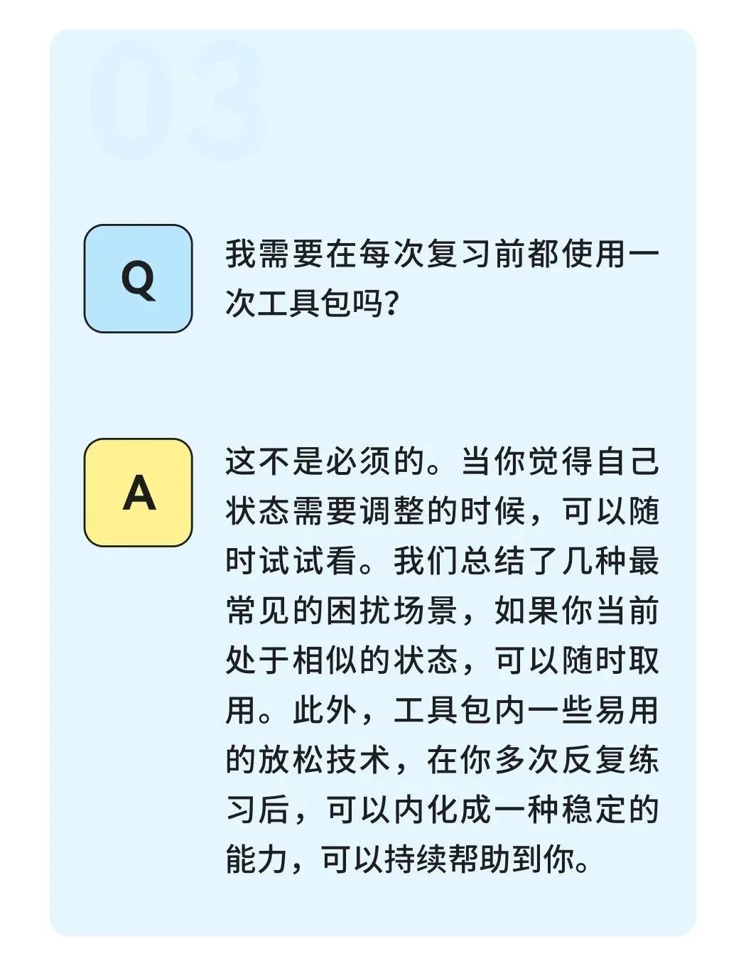 这份工具包完全公益免费,目的是帮助即将面临重要人生「大考」的小伙伴用科学方法稳住自身的力量,继续朝向目标有效行动。