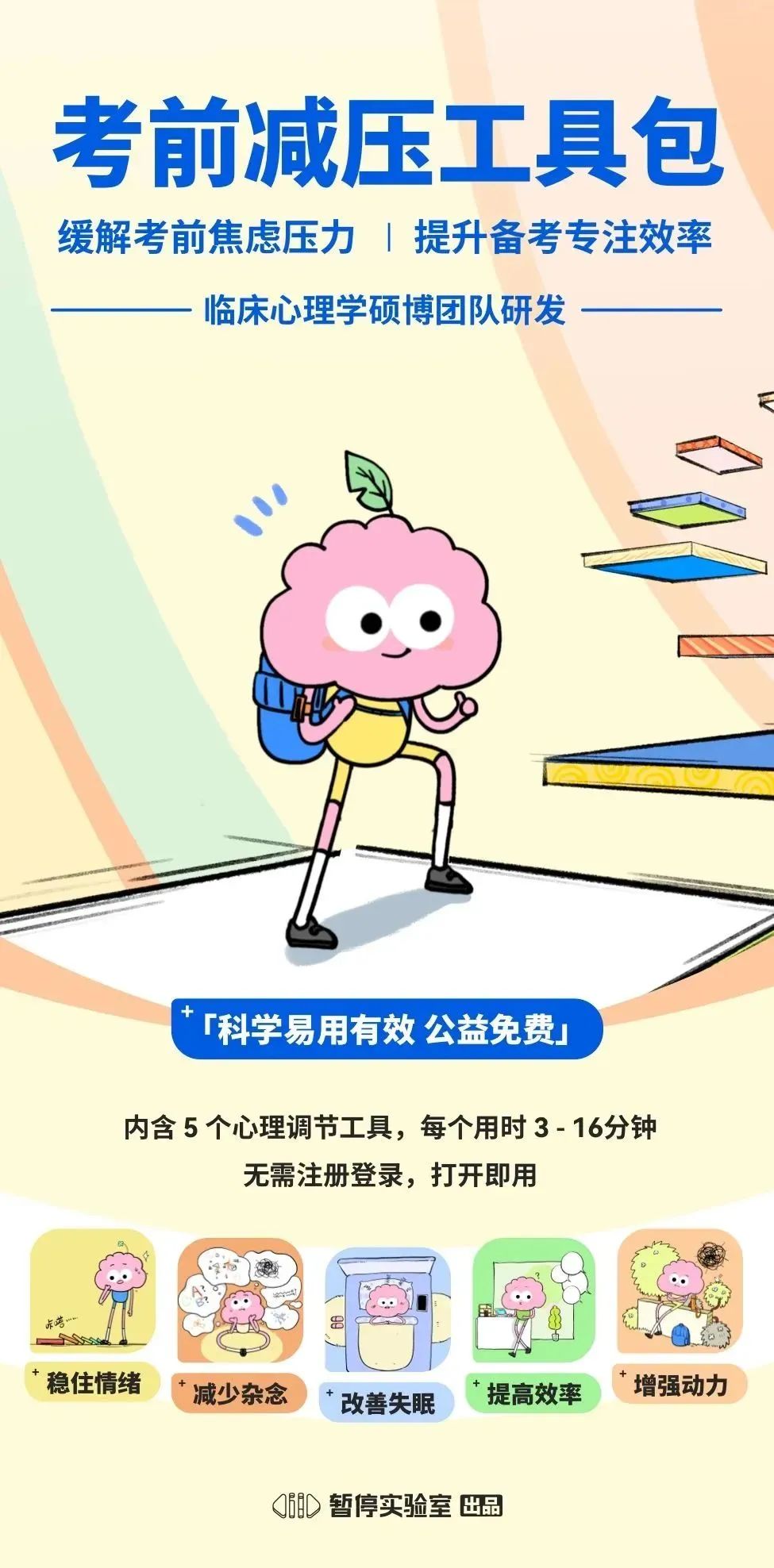 我们希望这份科学的心理学工具包,也是你的考前减压加油包,内含5组心理调节工具,每个工具用时3-16分钟左右,无需注册登录,无需任何辅助,打开即用,帮助正在迎接人生挑战的你,更快找回自己的稳定和力量,更少负担,更高效休息,更专注,更有行动力。