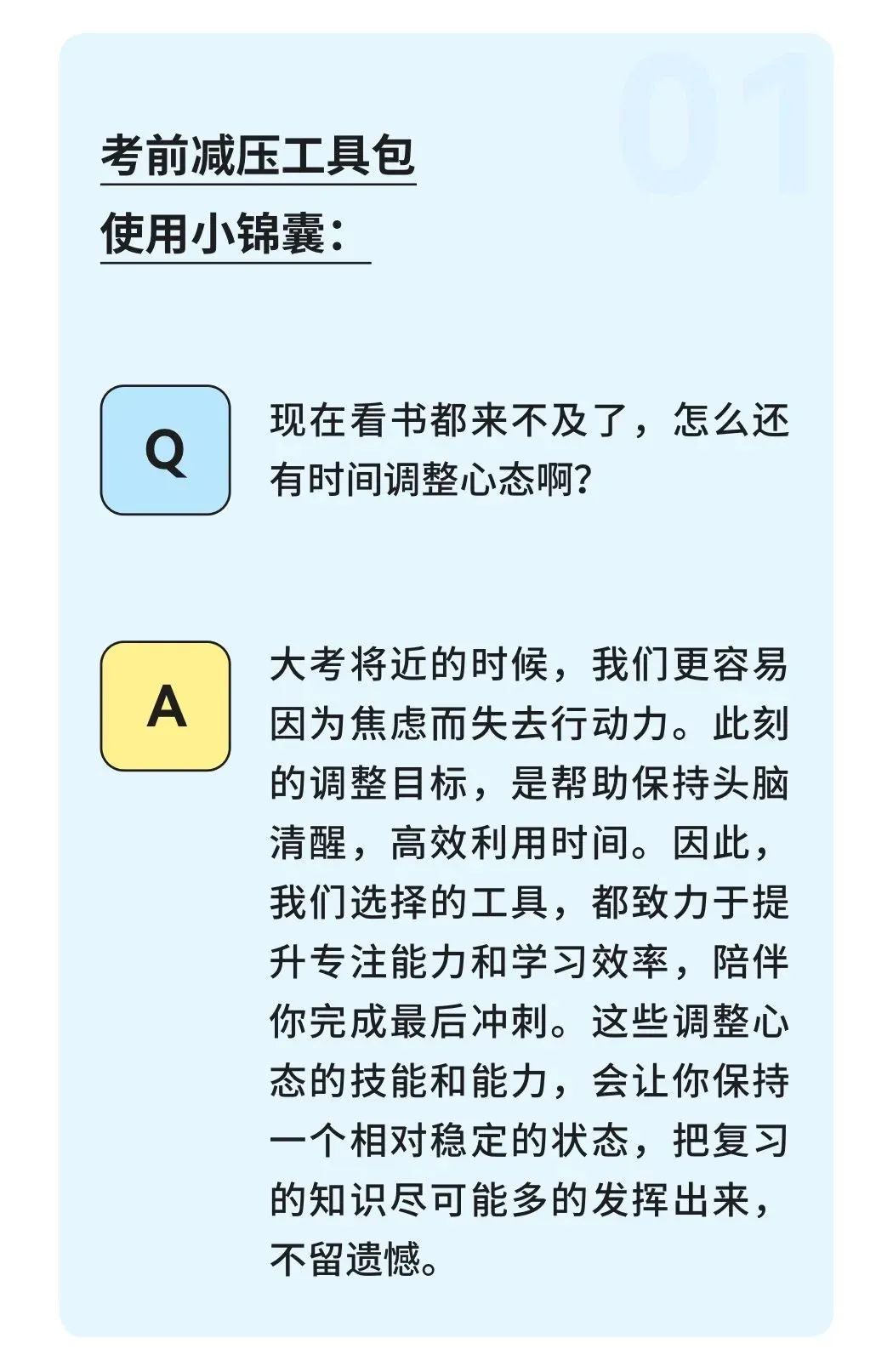 需要提醒的是,「考前减压工具包」并不是学生的特权。在人生各个阶段,我们都可能面临大大小小的生活应用类「考试」,比如一次重要的面试,一场关键的演讲。