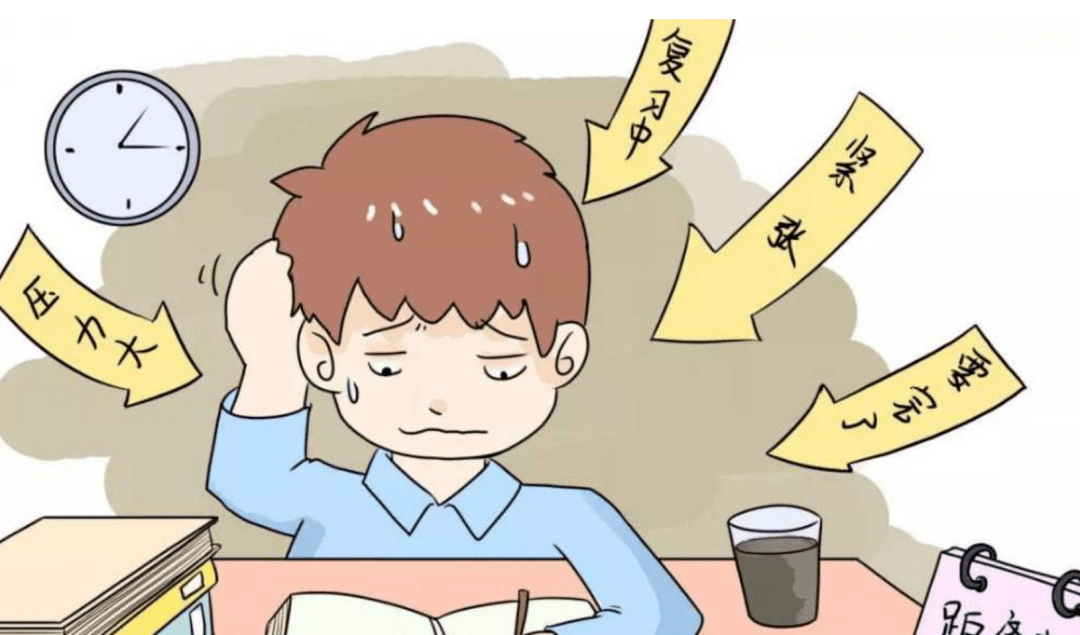 考试焦虑是指在应试情境刺激下受个人认识、评价等影响而产生的心理反应状态,个体可能感觉到生理或心理的不适。生理上的不适感通常表现在心跳加快、失眠多梦、莫名疼痛、胃肠不适、注意力分散等;心理上的不适感常表现为焦躁、紧张、恐慌、担心和回避等。