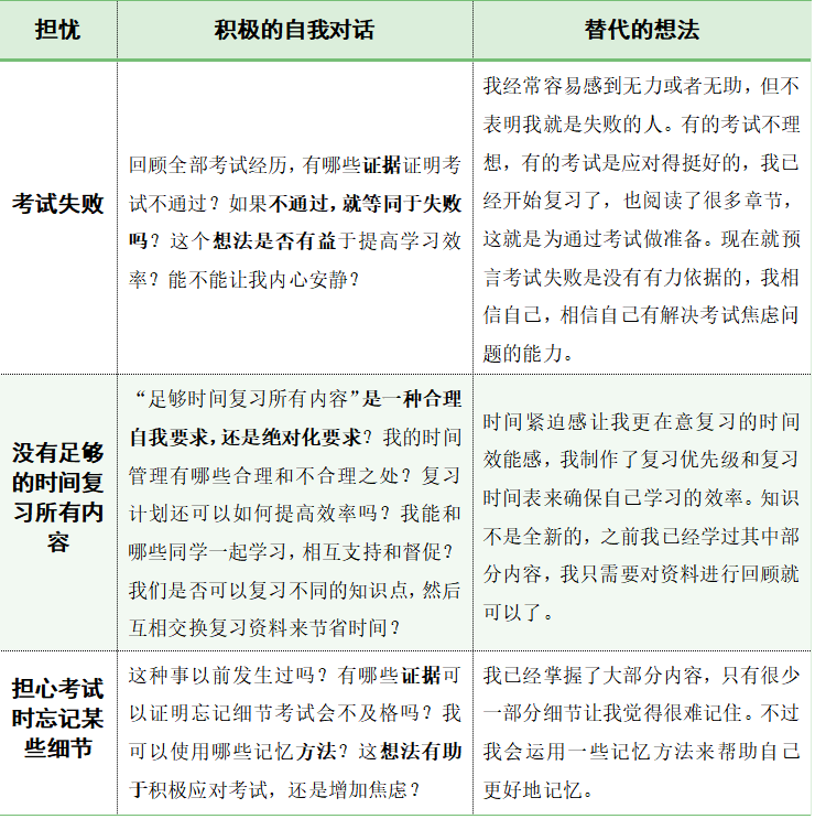 当我的头脑沉浸在关于考试的消极观念中,比如害怕失败、担心成绩不理想等时,我们会发现,慢慢地头脑里的声音会从考试转移到自己身上,尤其是形成了负向的自我认知,怀疑自己的能力,怀疑努力的意义。当你遇到这样的状况,我们可以采用“现实检验法”,给自己一点时间,进行积极自我对话。仔细梳理一下事实,澄清自己的担忧是否合理,有没有夸大或联想。你可以通过以下表格中的范例进行练习。