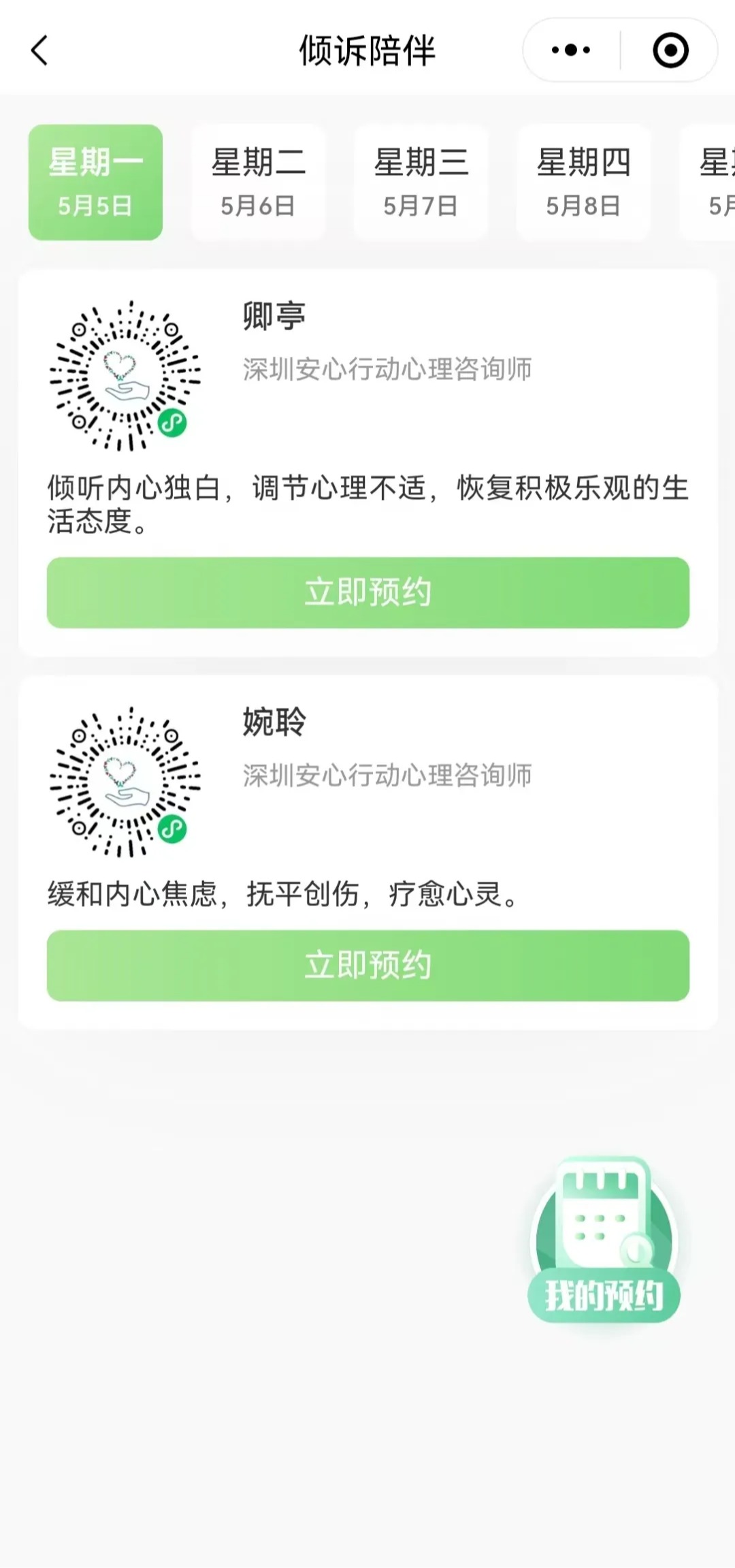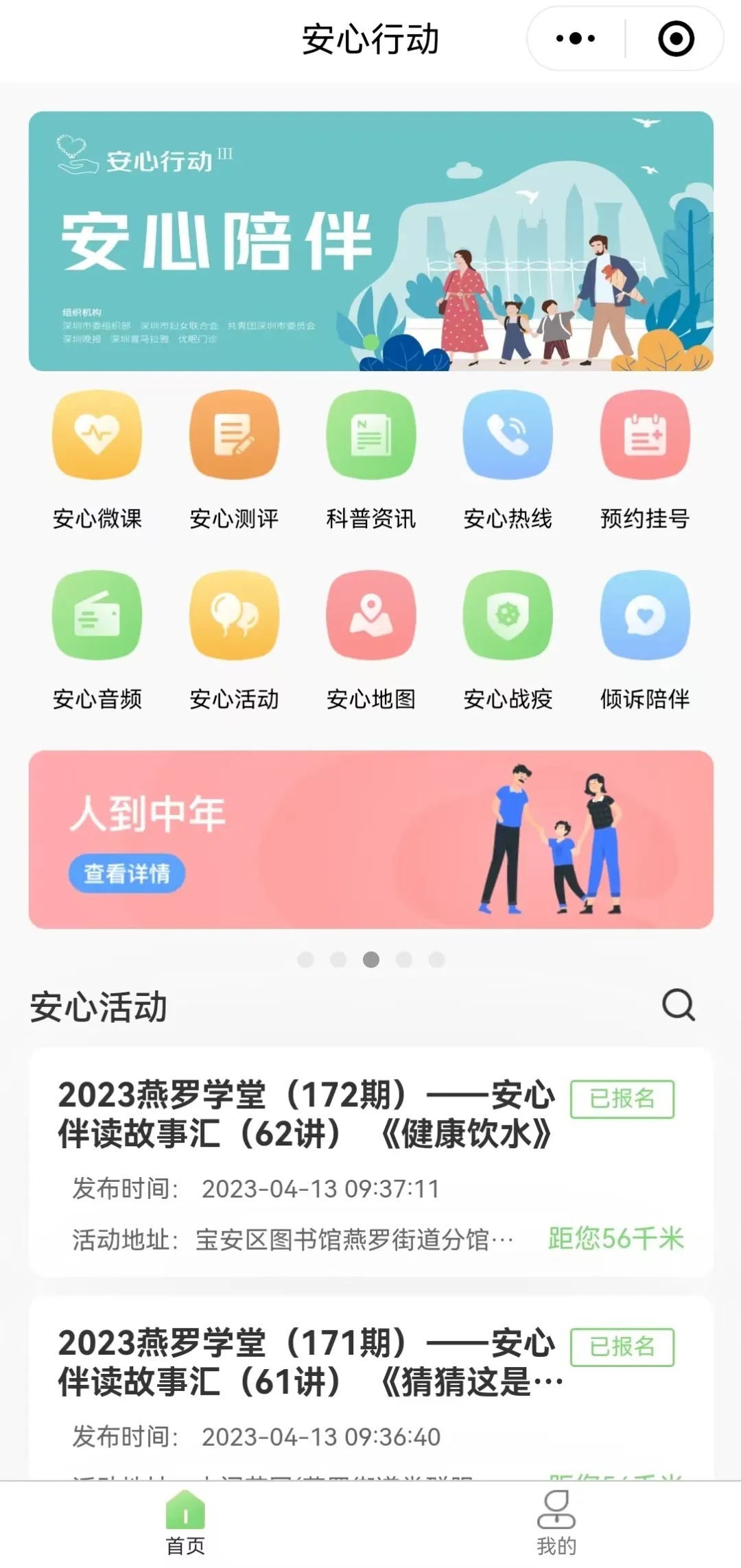 “安心行动”小程序整合了深圳市卫健委、市教育局、团市委、康宁医院等单位心理服务资源,设计“安心微课”、“安心测评”、“科普资讯”、“安心音频”、“倾述陪伴”(免费专业心理咨询)等功能,提供权威、热门、通俗易懂的心理健康知识,打造“指尖上”的心理健康服务平台,帮助市民有效排解焦虑紧张、惶恐不安等情绪问题。